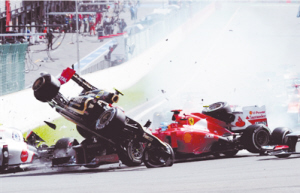 在9月2日的F1比利时站正赛中,1号弯道发生连环大撞车,格罗斯让、汉密尔顿、阿隆索、佩雷兹四位车手退赛。起因来自格罗斯让和汉密尔顿,汉密尔顿被格罗斯让逼出赛道后赛车失控,追尾格罗斯让,格罗斯让又追尾佩雷兹,并殃及阿隆索。格罗斯让的赛车受到前后夹击被撞得飞了起来,砸到阿隆索的赛车。迈凯轮的巴顿取得本站冠军。王飞 摄