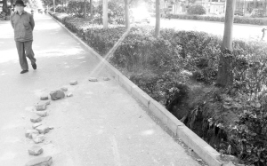 路面状况:正对着家属院门口的绿化带里,有一个深2米左右的坑,口径小,里面大,导致道路部分悬空。不知是哪位好心的市民,已经在路面上设置了“路障”,以免行人遭受其害