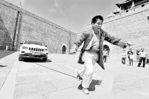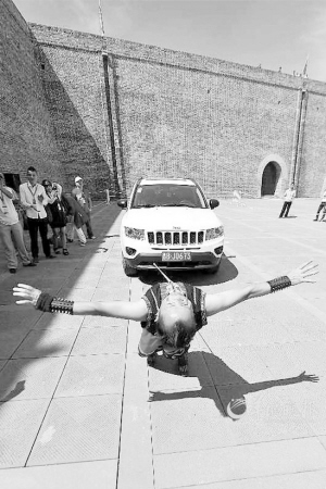 8月23日,在中国(大同)国际汽车文化节上,民间艺人杨光合在表演“眼皮拉汽车”。当日,在山西省大同市南城墙举办的中国(大同)国际汽车文化节上,身怀“绝技”的民间艺人们还表演了“腹部吸碗拔河”、“鼻子吹热水袋”等拿手绝活,令参观者大开眼界。