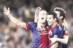 巴萨在双方近10次联赛交锋中取得7胜3平保持不败。巴萨近5个联赛主场全胜瓦伦西亚,近8个联赛主场对阵瓦伦西亚保持不败。双方联赛历史交锋154场,巴萨75胜39平40负占据上风,其中主场45胜21平11负。亚历山大-宋首次首发出场,阿尔维斯伤愈回到首发,法布雷加斯轮换出场。伊涅斯塔在赛前展示欧足联年度最佳球员奖杯。(王玲)