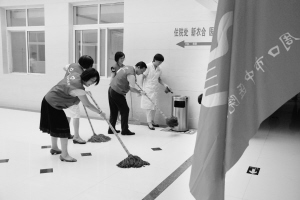 周口市中医院志愿者服务队自上周成立以来,团队本着“奉献、友爱、互助、进步”的志愿者精神,为营造尊重患者、尊重医务人员的良好氛围,努力构建和谐医患关系,昨日下午,志愿者在百忙中集合时间为中医院病房中的卫生间进行了全面清理打扫,得到医护人员和患者的赞扬,图为志愿者在为病房走廊进行打扫。
