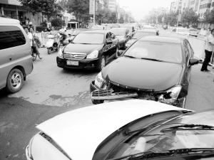 记者现场看到,黑色轿车前端被撞毁(如图),机油淌了一地,白色轿车车身损伤较轻,两辆轿车的安全气囊均打开。由于时值下班高峰期,事故车辆停在路中央,导致该路段拥堵严重。
