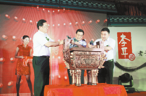 9月9日,在这个与“酒”字谐音的吉祥日子里,李耳集团在周口举行隆重庆典,庆祝周口李耳酒道馆开业庆典暨李耳酒业畅想系列新品隆重上市,全市近百家经销商及相关市领导、市直部门相关负责人到场祝贺。图为市财政局局长张子敬、市市场发场中心主任朱广斌与李耳集团董事长朱杰一起将爵中美酒注入九鼎内,共祝新品上市。