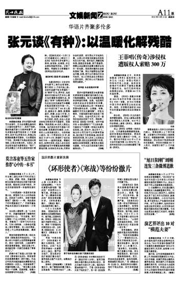 本报综合消息 近日,有消息称歌曲《传奇》版权所有人老孙文化(北京)有限公司把王菲和毛宁告上法庭,称其在未获得许可的情况下演唱此歌属于侵权行为,他们已经向相关法院提出诉讼,并索赔300万元的版权费。