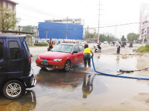 9月13日上午,记者在周口市区八一大道与文昌大道交叉口看到,两根水管把从路边井里抽出的“清水”排放到道路边,路过司机纷纷在此冲洗自己的爱车,一时间,这里成了司机们的“临时洗车点”。