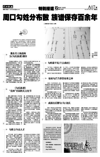 勾姓最早见于《山海经》,在宋版的《百家姓》中排第374位。我市的勾姓人,人数不多,却分布在商水县、项城市和川汇区等地。2004年在淮阳举行的中华首届姓氏文化节上,具有100多年历史的《勾氏族谱》“亮相”后备受各界瞩目,成为文化节上的一个亮点。