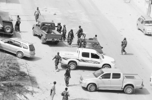 9月12日,索马里政府军和非盟驻索特派团在首都摩加迪沙的一家酒店外巡逻。