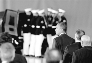 美国国务卿希拉里在仪式上呼吁相关国家领导人“尽其所能”恢复安全秩序,追究冲击美国外交机构示威者的责任。
