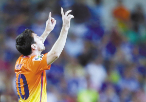 本报综合消息 北京时间9月16日凌晨02:00,2012/13赛季西班牙足球甲级联赛第4轮一场焦点战在阿方索-佩雷斯球场展开争夺,巴塞罗那客场4∶1取胜赫塔菲,阿德里亚诺连场破门,替补出场的梅西梅开二度,马斯切拉诺自摆乌龙,比利亚锦上添花巴萨取得4连胜继续领跑。