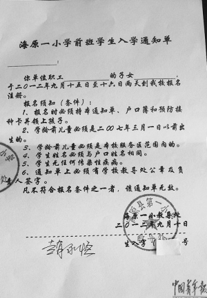 马龙向记者出具了自己颇费周折得到的“赞助票”。所谓“赞助票”,就是一张“海原一小学前班学生入学通知单”。