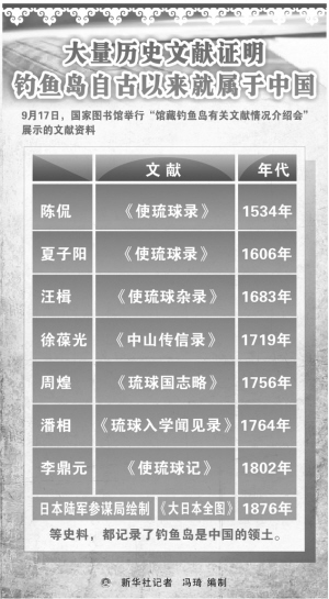 展出资料中,最早记载中国与琉球海上疆界的中国官方文献《使琉球录》引人注目。国家图书馆研究馆员黄润华介绍,自1372年明太祖朱元璋派杨载出使琉球,并册封察度琉球王始,其后500余年,中国明清两代朝廷先后24次向琉球王国派遣册封使,留下大量《使琉球录》,记录了钓鱼岛及其附属岛屿属中国版图的历史事实。此次展示的《使琉球录》(1534年),为明嘉靖年间册封使陈侃出使琉球归来后所著。书中记载:“过钓鱼屿,过黄毛屿,过赤屿,目不暇接……见古米山,乃属琉球者。夷人鼓舞于舟,喜达于家。”“琉球人认为过了钓鱼岛列岛,到了古米山(又称姑米山,即现在冲绳久米岛)后才算回到国家,钓鱼岛则毫无疑问在中国版图之内。”黄润华表示。