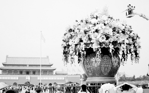 9月22日,工人在装饰天安门广场国庆主花坛。