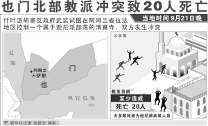 新华社开罗9月22日电(记者 王秋韵)萨那消息:也门北部阿姆兰省部落人士22日说,也门什叶派胡塞反政府武装和当地逊尼派部落21日晚起发生冲突,截至目前,已造成至少20人死亡。