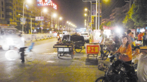 9月22日傍晚,记者在周口市区几个路口看到,各种摊贩侵占了快车道,不仅造成交通拥堵,还存在不小的安全隐患。