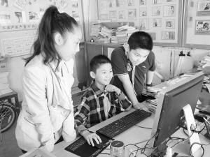 为进一步引导未成年人增进爱党爱国爱社会主义情感,昨天上午,周口市“向国旗敬礼,做有道德的人”网上签名寄语活动启动仪式在周口七一路二小举行。图为3名小学生在网上留言寄语,祝福祖国繁荣昌盛。