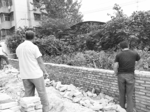 昨日下午,记者来到育新东路和大庆路交叉口看到,路口早已用蓝色的安全围栏堵住,禁止机动车辆通行。路面已经铺上了一层碎石,显得比较平坦,很多非机动车辆来往穿梭。育新东路南侧,是两所学校共用的操场和家属院,几名工人正在砌围墙,将道路和家属院、操场隔开。围墙已经垒起了80厘米高,据工地负责人孔经理介绍,这堵围墙打算砌2.5米高,长一二百米,目前操场的围墙已砌好,家属院的仍在砌,预计国庆节期间就能完工。