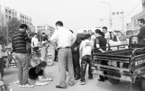 据目击者介绍,当时机动三轮车和电动三轮车由南向北并排行驶,拐弯时机动三轮车挂翻了电动三轮车,电动三轮车女车主从车上摔倒在地,胳膊受伤流血。