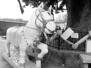 由于罗成武艺高强,又智勇双全,从没打过败仗,被后人称为“常胜将军”,他所骑的战马金线白龙驹很有灵气,当地老百姓也很景仰,就重塑了金线白龙驹的塑像(图二)。当地村民认为,如果骑上此马能够免灾免难,心想事成,孩子骑此马,还能够顺利考上大学。