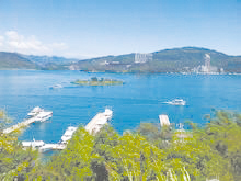 日月潭是台湾的“天池”,湖周35公里,水域9平方公里多,为全省最大的天然湖泊,也是全国少数著名的高山湖泊之一。其地环湖皆山,湖水澄碧,湖中有天然小岛浮现,圆若明珠,形成“青山拥碧水,明潭抱绿珠”的美丽景观。清人曾作霖说它是“山中有水水中山,山自凌空水自闲”;陈书游湖,也说是“但觉水环山以外,居然山在水之中”。三百年来,日月潭就凭着这“万山丛中,突现明潭”的奇景而成为宝岛诸胜之冠,驰名于五洲四海。