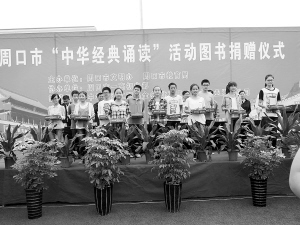 昨天上午,“中华经典诵读”活动图书捐赠仪式在周口一高初中部操场举行,一家来自北京的图书发行企业为该校每个班级捐赠一套经典著作。据了解,该企业将为全市4000多所中小学的每个班级都捐赠一套经典著作,以配合“中华经典诵读”活动的开展。晚报记者 宋风 摄