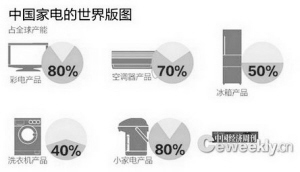 来自中国家电协会的数据表明,目前中国彩电产品占全球产能的80%,空调器产品占全世界产能的70%,冰箱产品占全世界产能的50%,洗衣机产品占全世界产能的40%,绝大多数小家电产品80%以上的产能也在中国,中国目前已经成为名副其实的世界家电生产中心。