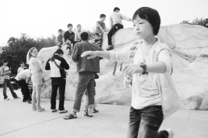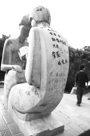 昨天,有市民拨打本报新闻热线,反映周口人民公园脏乱差。记者随后赶到公园,用相机记录下一幕幕乱象——写有“人民公园”字样的景观造型石上骑着不少孩子(右图),一处雕塑被人画得密密麻麻(左图)。晚报记者 朱海龙 摄
