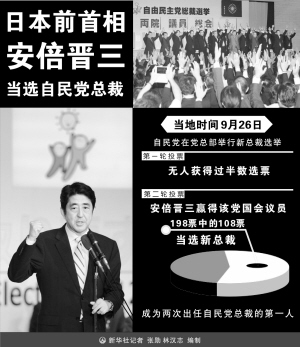 当天下午,自民党在党总部举行新总裁选举,对安倍晋三、前防卫大臣石破茂和前外相町村信孝等5名候选人进行投票。由于无人在第一轮投票中获得过半数选票,得票数位居前两位的石破和安倍进入决胜轮。安倍在第二轮投票中实现逆转,赢得该党国会议员198票中的108票当选新总裁。