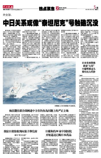 新华社电 外交部部长助理乐玉成9月28日说,如果日方继续一意孤行,在错误的道路上走下去,那么中日关系这条大船就可能像“泰坦尼克”号一样触礁沉没。