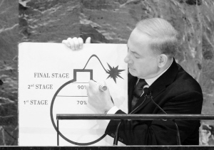 内塔尼亚胡还通过一张画有炸弹和导火索的图表向各国代表说明了他对伊朗核计划进展情况的划分。他说,伊朗花了几年时间,目前已完成了占图表70%的第一阶段工作,并将最迟于明年夏天完成占图表20%的第二阶段,生产出足够的中等浓度的浓缩铀,最后仅需几个月甚至几个星期的时间就能完成剩余10%的工作,制造出第一枚核弹。他强调,这条“红线”应该被划在伊朗完成第二阶段、进入最后阶段之前。