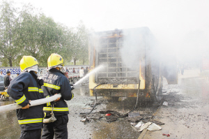 据了解,消防官兵赶到时,这辆车牌为苏NAQ617的“依维柯”广告宣传车被滚滚浓烟围住。车主穆先生说:“我当时正驾驶宣传车由南至北行驶,突然闻道一股浓浓的烟味,就急忙停车查看,一下车就看见车尾部着火了。”穆先生赶忙拿来驾驶室内的灭火器扑救,但由于火势太猛无法控制。当时正在清扫街道的环卫工人张师傅说:“车着火时我正在清扫街道,火是由车尾开始燃烧的。”