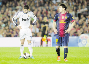 本报综合消息 北京时间10月8日01∶50,2012/13赛季西班牙足球甲级联赛第7轮一场焦点战在诺坎普球场展开争夺,巴塞罗那主场2∶2战平皇家马德里,C·罗纳尔多和梅西均梅开二度。巴萨开局6连胜被终结,但仍领先皇马8分。