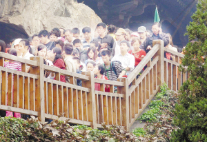 10月4日,在洛阳龙门石窟景区,游客们在参观栈道上缓缓前行。今年中秋、国庆假日期间,由于高速公路首次实行“七座以下小客车免费”政策,加之郑武高铁的开通,有力刺激了河南旅游市场,多数景区各项指标创下新高。据河南省旅游局统计,“双节”期间,全省共接待海内外游客3670.9万人次,实现旅游收入208.5亿元,同比分别增长27.09%、32.5%。新华社记者 王颂 摄