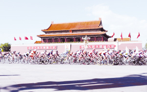 北京时间10月9日,第二届环北京公路自行车赛继续展开争夺,在晴朗的天空下,骑手们通过了许多北京的著名建筑,其中就包括天安门。