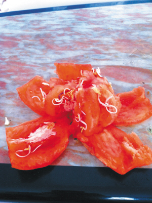 10月10日,周口市区的王女士从冰箱里拿出一个外观很好的西红柿准备做饭用,孰料切开一看,西红柿里居然长出许多嫩芽,显然,西红柿已经不能食用。王女士随即向本报热线咨询,这个西红柿是她10天前购买的,然后保存在冰箱的保鲜室里,怎么会发芽呢?对此,川汇区蔬菜研究所相关专家表示,这种情况很罕见,但种子在适合生长的环境下发芽仍属正常现象。可以确认,发芽后的西红柿虽然没有毒,但在其发芽过程中营养物质会发生一定变化。为安全起见,市民最好不要吃这样的蔬菜。