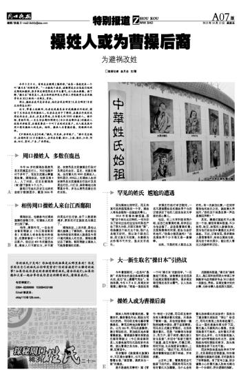 操瑞法说,上述内容,是他从操氏族谱上了解到的。受命赴任陈州府做官的操姓人就是现今周口境内操姓人的先祖。操瑞法最近还了解到,鄱阳郡新义操姓人可能是曹操的后裔。