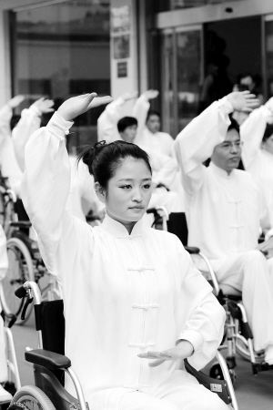 10月10日,兰州市城关区残疾人综合服务中心组织肢残人士在社区表演轮椅太极。