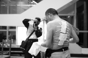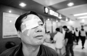 记者在医院看到,大部分伤者身上都有纱布裹着。50岁的金师傅右眼也贴着一块纱布,事发时他坐在B区16排10号,他告诉记者:火光瞬间穿过,眼前一黑,身边一排人倒下,自己右眼也看不清了。医生已经给他做了伤口处理,并让他第二天再去医院做进一步治疗。