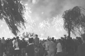 孙军刚到观众席附近,又有一束烟花射了过来,离观众席已经很近很近,但绝大多数观众不以为然,依旧仰头盯着烟花。突然,又是一阵呼啸声,孙军转头一看,一个火球从对岸飞了过来。“我和战士们立即张开防火毯,迎了上去,想挡住火花射进人群。”