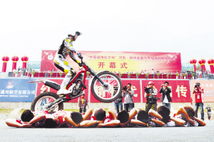 10月15日,车手在开幕式上进行摩托车特技表演。