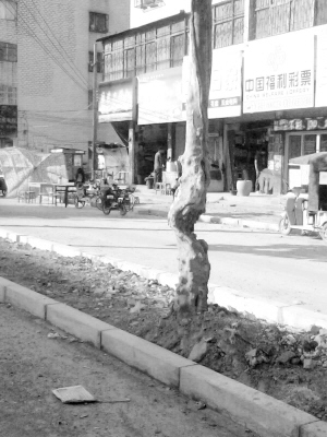□见习记者 王凯 文/图 在工农路与交通大道交叉口北约50米处,有一棵“畸形”树。据了解,这棵树可能长期受到机动车的碰撞,导致树体受损变形。在工农路与黄河路交叉口路北,一棵树木的根部只剩一半。 这两棵树很可能断裂,危及行人。