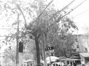 在文明南路有一棵桐树,枝叶已经干枯,树枝“触摸”着居民楼 ,枝叶间纵横交错的电线不计其数。一些市民担心,如果这棵桐树遇到特殊情况倾倒, 将会危及附近居民的生活用电及人身安全。
