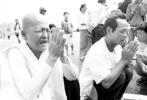 西哈努克逝世消息传出后,很多人在佛寺中为他焚香祷告。