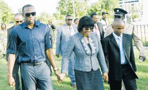 北京时间10月16日,牙买加百米飞人博尔特(左)与总理辛普森·米勒(中)以及女子短跑名将坎贝尔·布朗(右),现身金斯敦国家英雄纪念碑,为英雄敬献花圈。