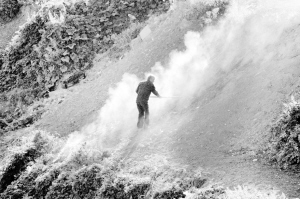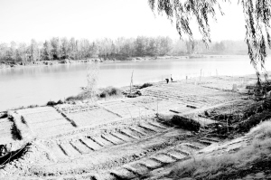 10月17日上午,记者在市区八一大道桥附近看到,沙颍河河床上被市民开垦出了大大小小几十块菜地(图一),一位老者在焚烧杂草,挥锄开荒(图二)。