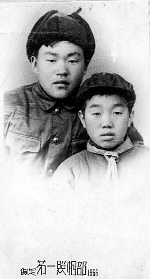 1965年12月22日,是我换上军装即将离家的前一天。一向爱说爱笑、活泼可爱的小弟刘国明却像霜打的茄子——蔫了。他拉着我的手,眼里含着泪水,依依不舍地跟我说:“二哥,我真不想让你走。你走了,以后我想你了可咋办?”他的话一下提醒了我。我说:“走,咱兄弟俩照相去,你把相片放在身边,这样不就天天和二哥在一起啦。”于是我当即领着他,跑到十里外的县城水寨镇高高兴兴照了这张合影。