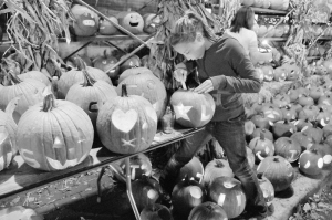 10月20日,在美国海伍德市举行的南瓜节上,一名女子点亮南瓜灯。