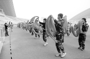 10月20日起,周口市第二届运动会开幕式文体表演开始在市体育中心体育场现场排练。26日晚,这里将进行开幕式文体表演的第一次带观众彩排。图为昨天下午,群众演员排练红绸舞。