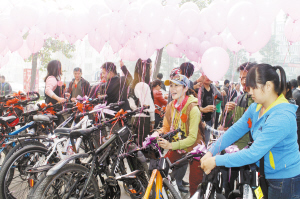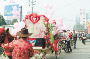 本报讯 10月20日一早,周口市区七一东路老卫生局家属院门前,新郎李勇正在为自己的婚礼不停忙活。一辆扎满花束的马车作为婚车,近50辆单车的车把上也被骑友们仔细地绑上粉色的气球和彩带(如图一)。新郎李勇和新娘陈小飞的浪漫单车婚礼在当日如期举行,并取得圆满成功。