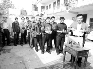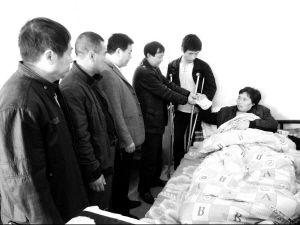 20日10时,记者在张体林家采访时,看到四五十名商户正在为张体林一家捐钱。短短30分钟,商户就捐了1万多元。随后,商户代表李双喜、张高峰等人把爱心款交到张体林的妻子庞霞手里,“赶紧让体林带着你去化疗吧,今后你家的困难咱商户一起给扛着!”接过钱,庞霞泪如雨下,泣不成声(如图二)。商户陈太松说:“我捐了1000元,钱虽然不多,但是在众多爱心商户的关心和帮助下,张体林一家一定会摆脱困境。”李双喜告诉记者:“清集镇个体私营经济协会尽全力帮助他。同时,也希望社会上有更多的好心人向这一家人伸出援手。”