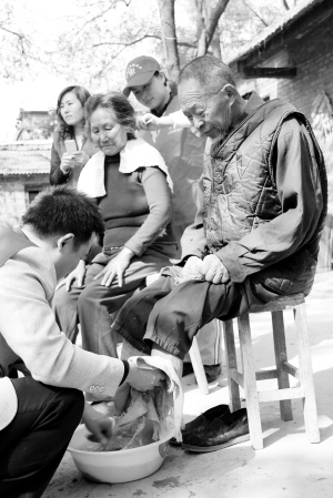 图四:两名“义工儿女”分别在为空巢老人徐公云夫妇理发、洗脚。晚报记者 金月全 摄